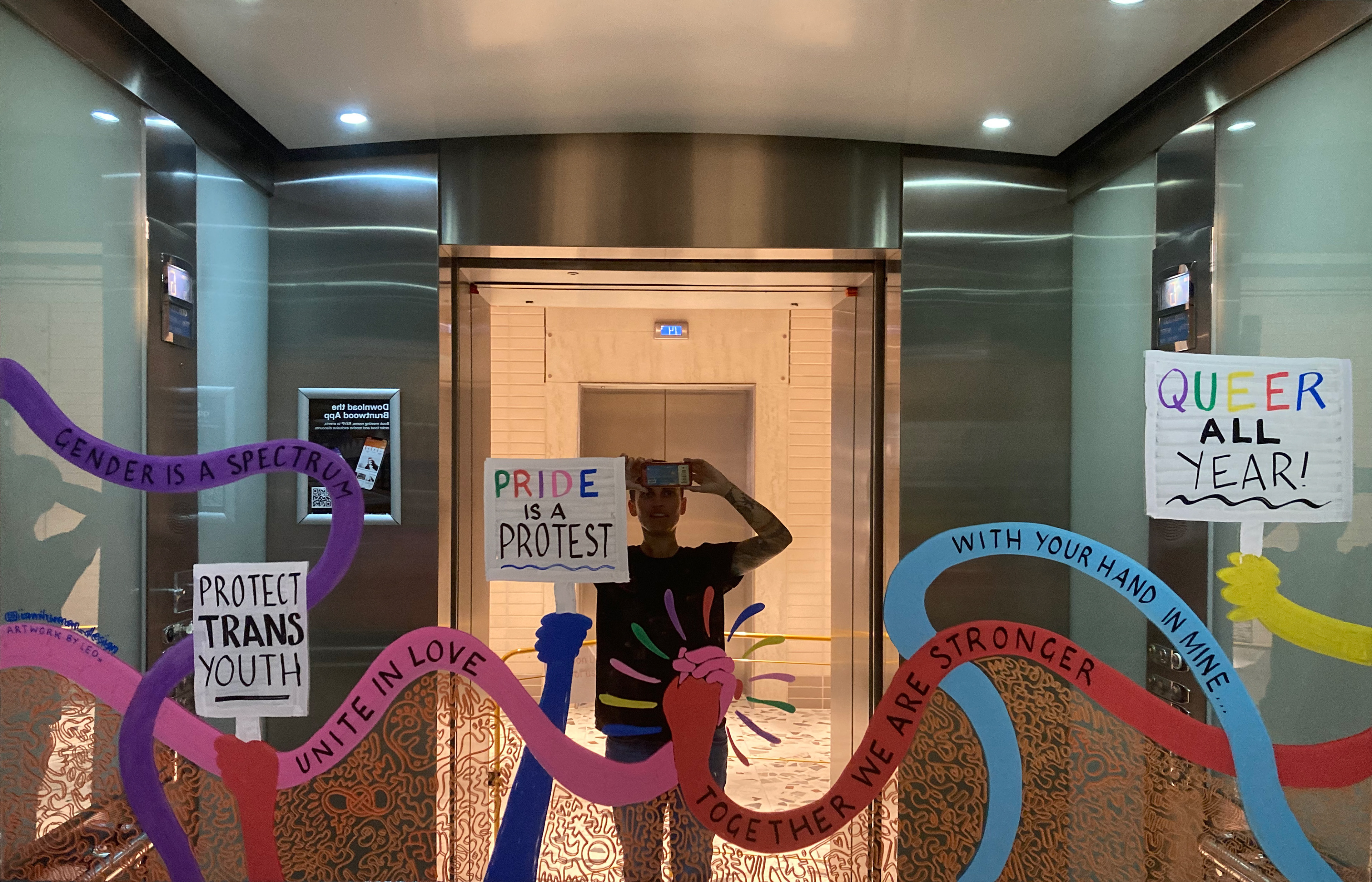 In the run up to Pride 2022 Bruntwood invited me to decorate their mirrored lifts and bathroom with themed illustrations carrying positive messaging. Thanks to Homotopia for setting up this partnership.
