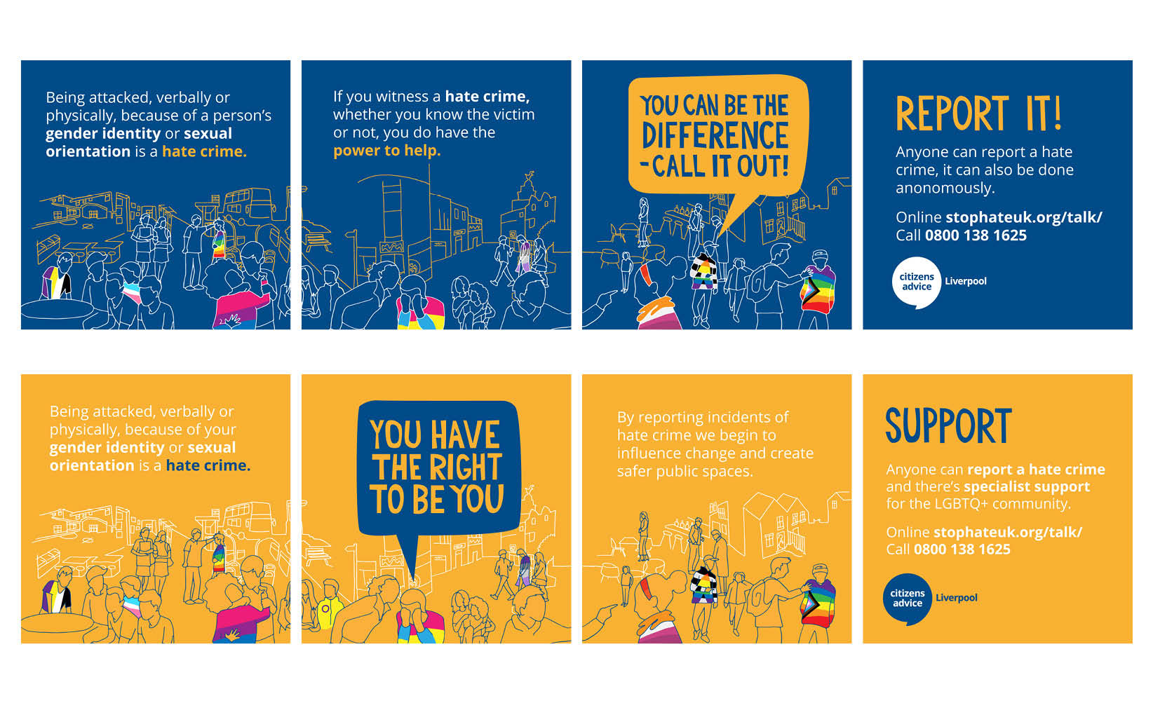 Citizen's Advice Liverpool approached me to develop a campaign around raising awareness of LGBTQIA+ hate crime, how to report it and how CAL can help. We devised 2 versions, one for the LGBTQIA+ community and one for Bystanders and witnesses. The campaign was rolled out in two parts with a short teaser campaign for Hate Crime Awareness Week and then with 2 longer videos for in early 2022. (Animation build by Martin Shannon-Smith)