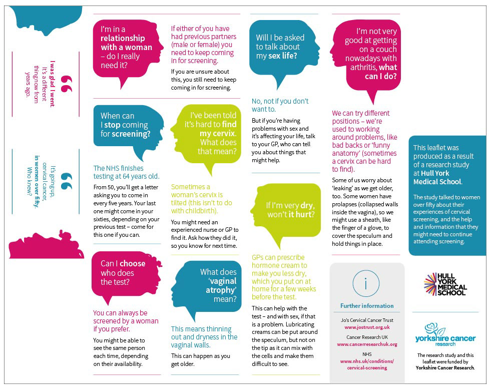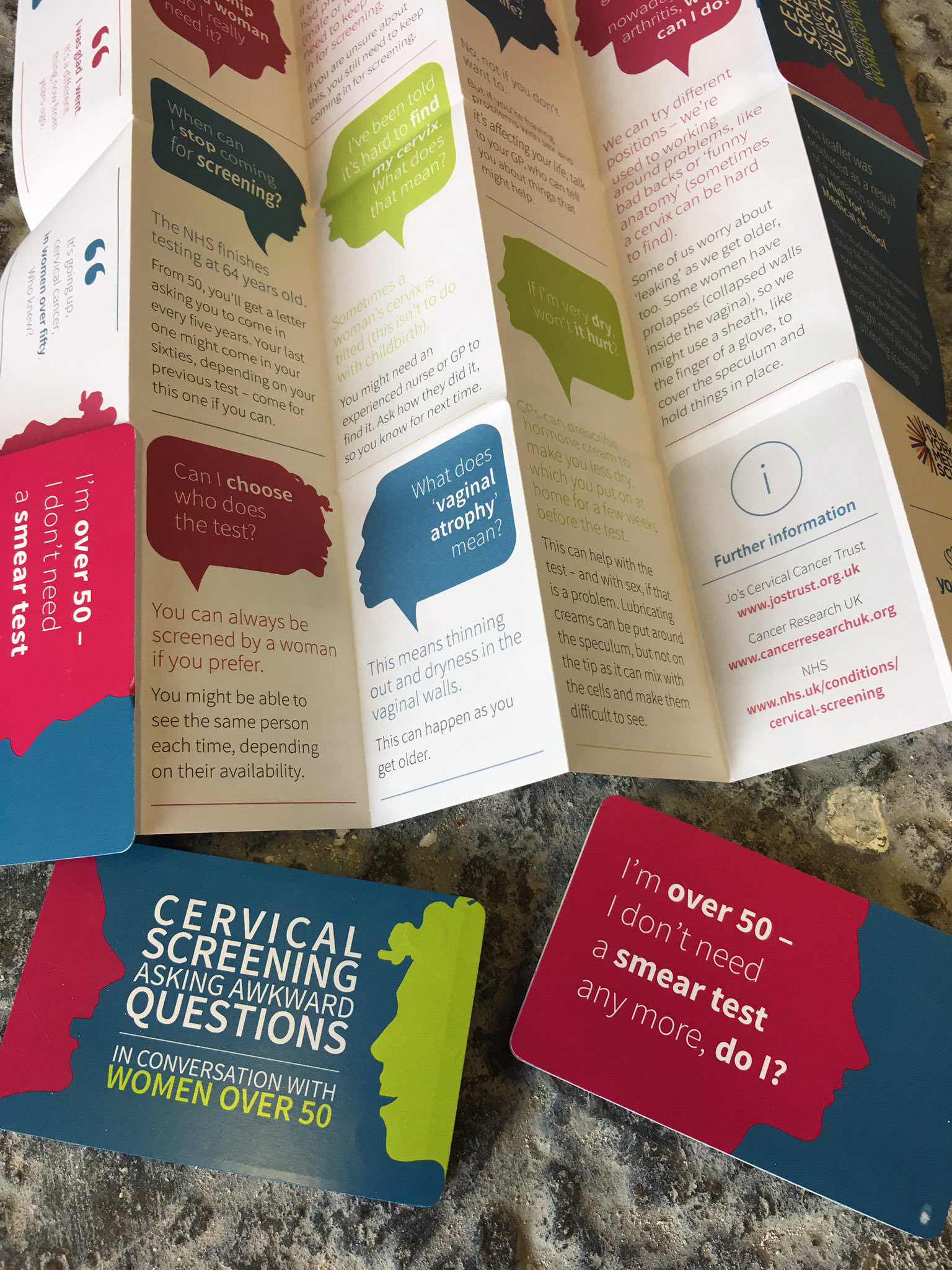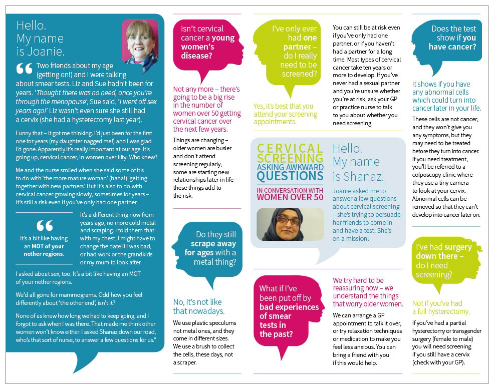 I worked with Hull York Medical School to design a campaign to raise awareness of cervical screening in women over 50. HYMS' research found that women over 50 weren't attending regular screening often due to not wanting to ask personal questions. A fold out leaflet was produced as well as posters for GP surgeries.