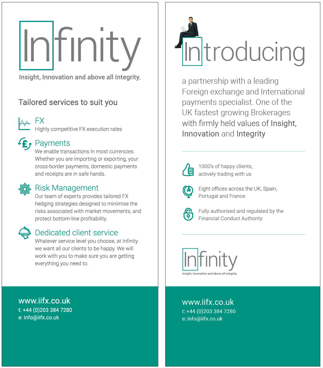 I have worked with Infinity International for the last 6 years, creating various communications from in-house forms and documents to client facing brochures, forms and PowerPoint presentations. In 2017 they underwent a re-brand which I had to help implement across the business.