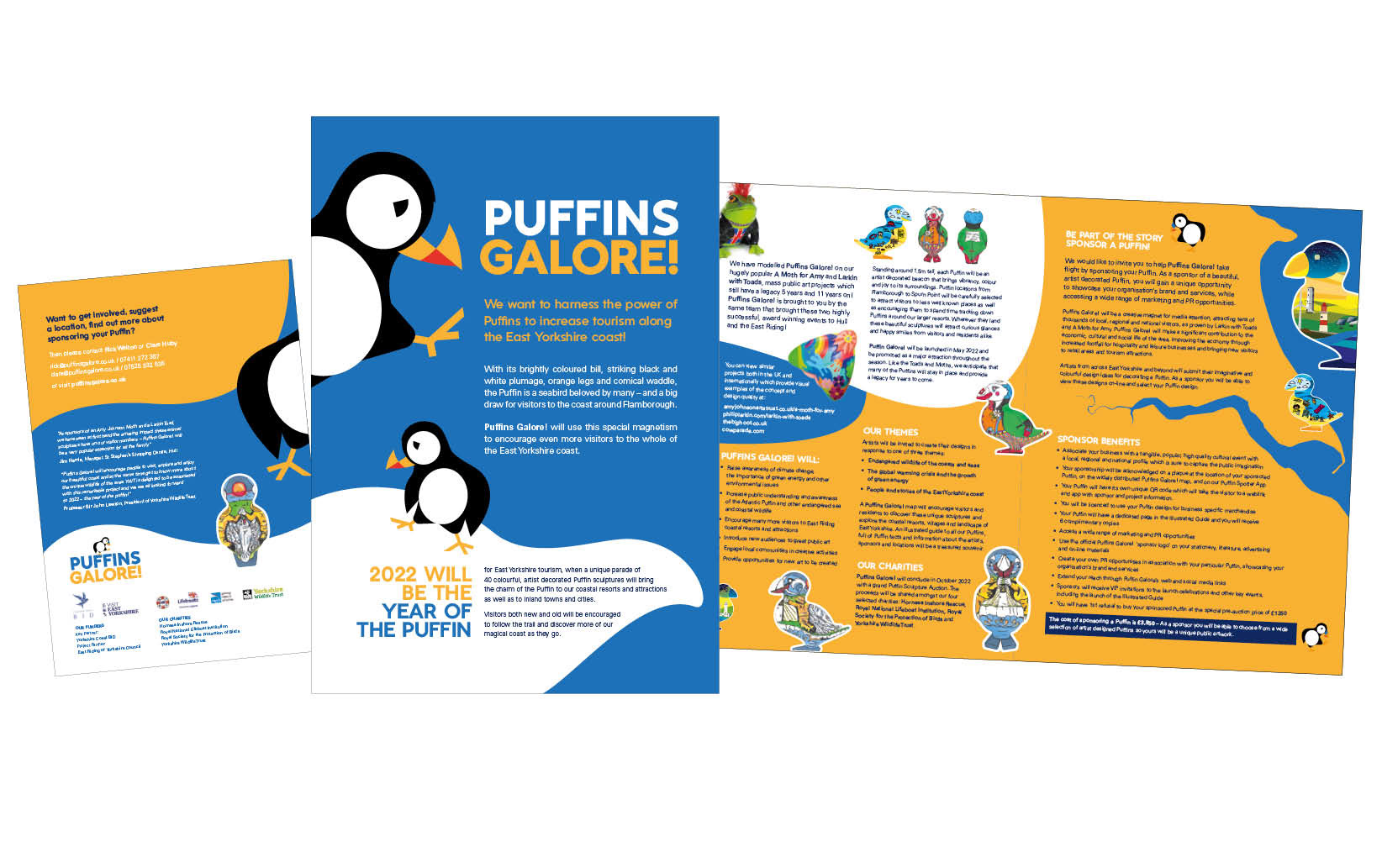 Puffin Parade, as a project, aims to attract more visitors to the East Yorkshire Coast through a mass participation public art event modelled on the hugely successful and award winning Hull and East Riding trails – ‘Larkin with Toads’ and ‘A Moth for Amy’. Artists will decorate 40 1.5m tall puffins, eqch sponsored by local businesses and then auctioned to raise money for specified charities. I created a logo and various marketing items.